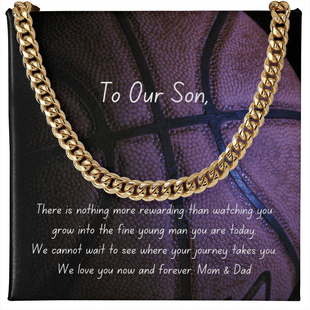 The beautifully polished stainless steel or 14k yellow gold chain is wonderfully weighted and adjustable, making it a great gift for any occasion. Cuban Link Chain comes gift boxed with a basketball themed message card featuring our standard message as shown. Or, personalize the basketball themed message card with a special name or message of your choosing