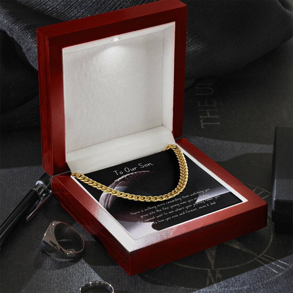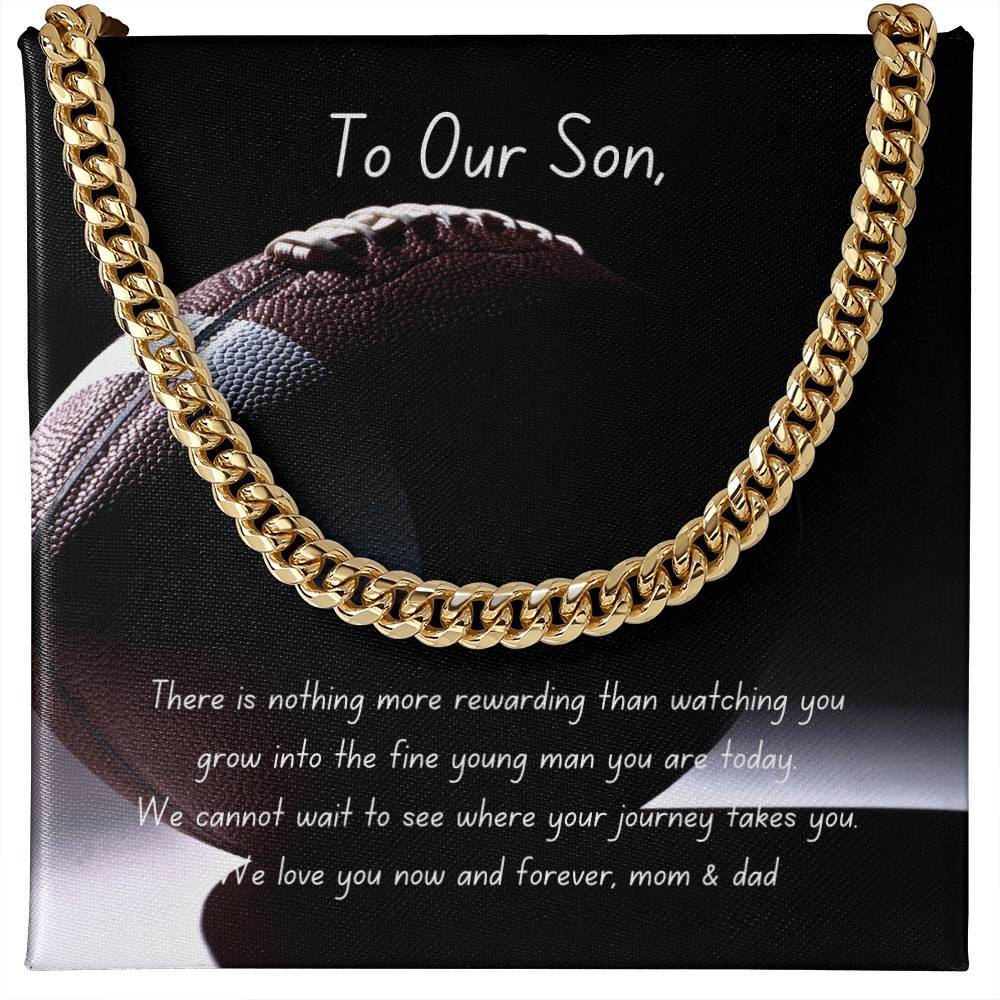 Our classic Football Themed Cuban Link Chain Necklace is a perfect accessory for any football enthusiast.